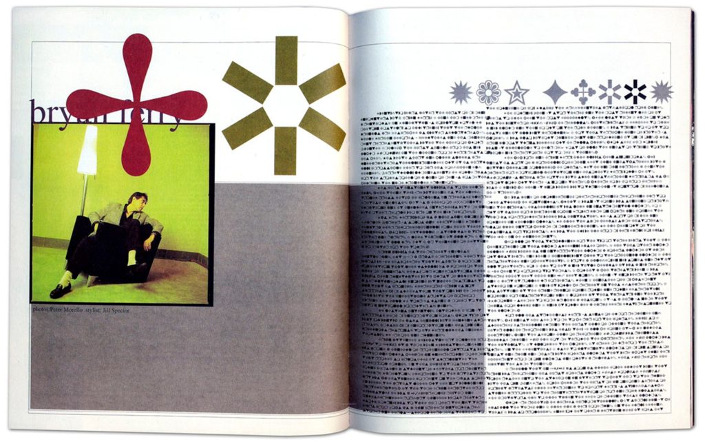 در اوایل دهه ۱۹۹۰، دنیای طراحی گرافیک همچون یک آزمایشگاه استریل بود؛ تحت سلطهی کامل قوانین سختگیرانهی «مدرنیسم» و «سبک سوئیسی» که در آن، خوانایی مقدسترین اصل محسوب میشد و همه چیز باید روی خطوطِ نامرئیِ نظمدهنده یا همان «گرید» (Grid) استوار میبود. اما دیوید کارسون، یک جامعهشناس که هیچ آموزش آکادمیکی در زمینه گرافیک ندیده بود، به شکلی متفاوت وارد این فضای اتوکشیده شد و تمام این ساختارها را در هم کوبید. اوج این ساختارشکنی در سال ۱۹۹۴ و در شماره ۳۰ مجلهی موسیقیِ «ریگان (Ray Gun)» رقم خورد؛ لحظهای که میتوان آن را معادلِ گرافیکیِ «کنسرتهای نیروانا» دانست. کارسون که مسئولیت طراحی مصاحبهای با خوانندهی مشهور، «برایان فری (Bryan Ferry) »را بر عهده داشت، پس از خواندن متن مصاحبه، آن را چنان کسل کننده و بیمایه دید که تصمیم گرفت دست به کاری غیرقابلتصور بزند. او به جای تلاش برای خوانا کردنِ متن، کلِ مصاحبه را با فونت (Zapf Dingbats) صفحهآرایی کرد. این فونت هیچ حرف یا کلمهای ندارد و تنها شامل مجموعهای از نمادها، شکلکها و علائمِ تزئینی است. نتیجهی کار، صفحاتی بود که عملاً «ناخوانا» بودند و مخاطب برای درک محتوا باید مانند یک رمزگشای باستانی عمل میکرد.