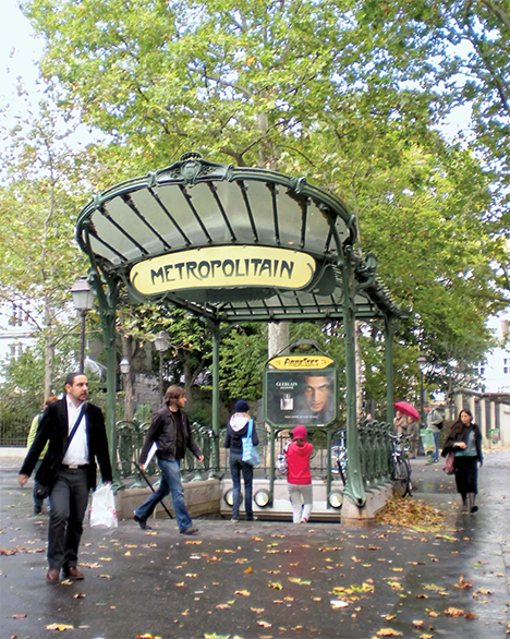تأثیر این تقلیدها زمانی عمیقتر شد که از سطحِ گرافیک دوبعدی فراتر رفت و به دنیای اجسام و معماری (فضای سهبعدی) سرایت کرد. طراحان و معمارانِ سراسر اروپا با الهام از «خطوط شلاقی- Whiplash lines» و فرمهای گیاهیِ موچا، شروع به تغییرِ چهرهی شهرها کردند. برجستهترین نمونهی این تأثیرپذیری را میتوان در آثار «هکتور گیامرد (Hector Guimard)» دید؛ معماری که ورودیهای متروی پاریس را طراحی کرد. گیامرد با تقلید از همان انحناهایی که موشا برای کشیدنِ موهای سارا برنارد استفاده میکرد، آهن و شیشه را شکل داد. بدینترتیب، آنچه موشا روی کاغذ کشیده بود، توسط مقلدانش به نردههای آهنی، پایههای لامپ، و نمای ساختمانها تبدیل شد. این فرآیندِ اقتباس باعث شد تا پاریسِ خاکستری و سنگی، ناگهان شکلی ارگانیک و زنده به خود بگیرد.