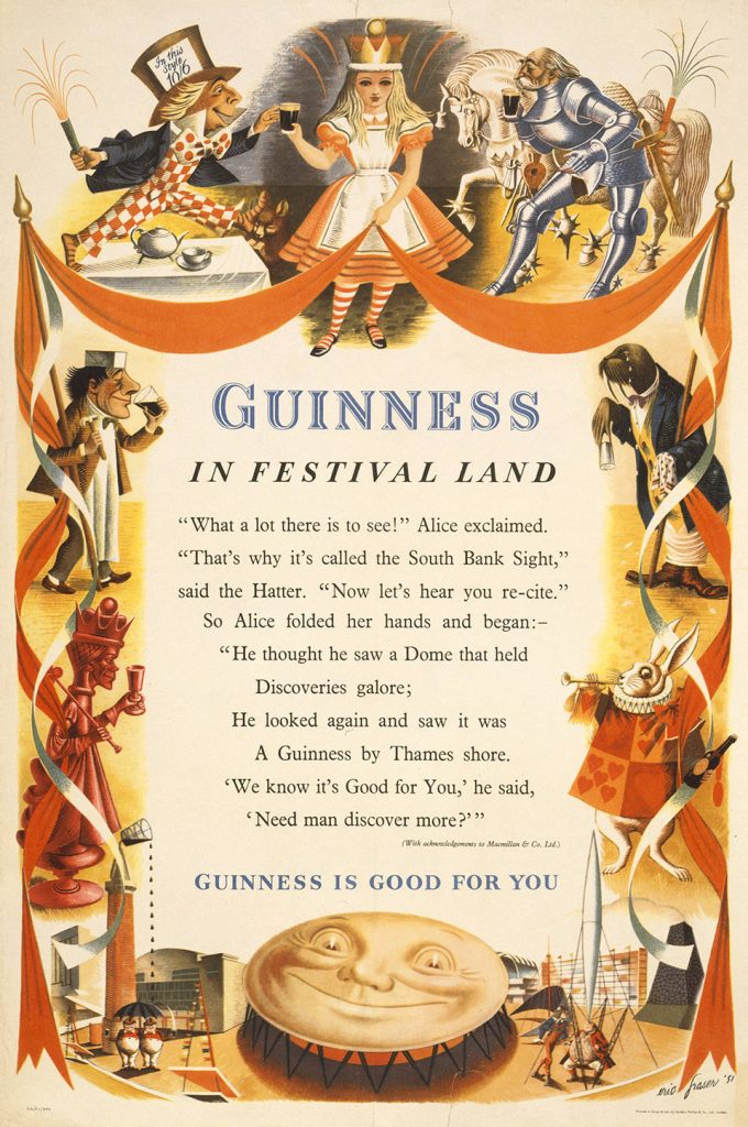 طراحیهای چاپ تجاری نیز با برگزاری جشنواره رونق گرفت. در «باغهای لذت» باترسی (Battersea Pleasure Gardens) که بیشتر فضایی تفریحی و سرگرمکننده داشت، شرکت تولیدکننده نوشیدنی گینس (Guinness) با ساعت مکانیکی ۲۵ فوتی خود جمعیت را سرگرم کرد. در پوستر «گینس در سرزمین جشنواره» (Guinness in Festival Land) اثر اریک فریزر، صحنهای از داستان آلیس در سرزمین عجایب بازآفرینی شده و تمام شخصیتها، از کلاهدوز دیوانه تا مهرههای شطرنج، در حال نوشیدن گینس هستند.