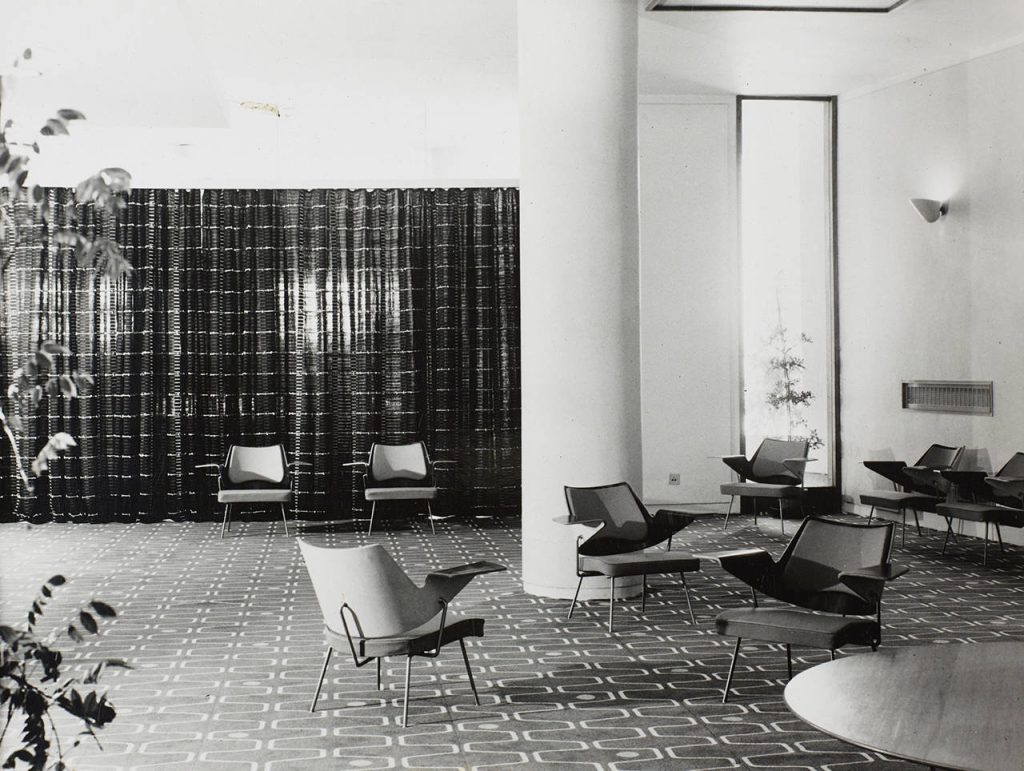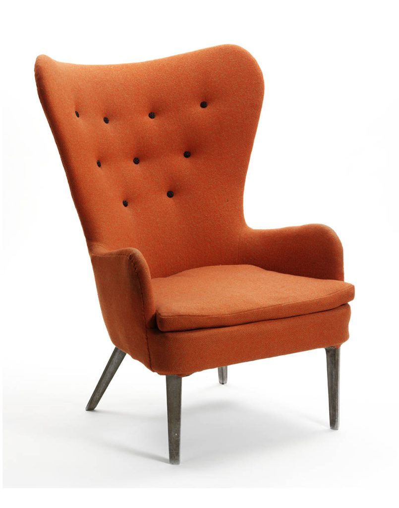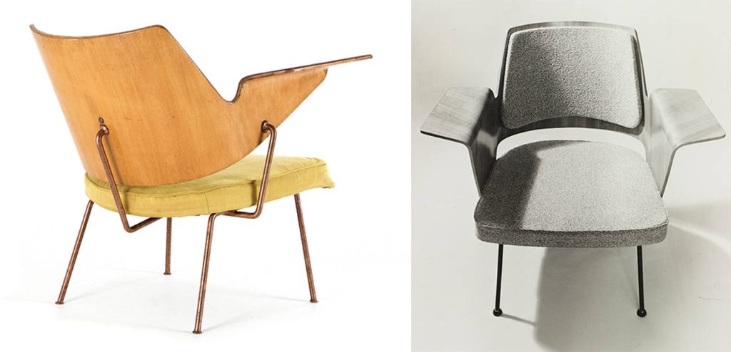 (راست): صندلی دستهدار مدل ۷۰۰ (۷۰۰ armchair)، طراحیشده توسط رابین دی (Robin Day)، ساختهشده توسط Hille، حدود سال ۱۹۵۶. © بنیاد رابین و لوسین دی / عکس: تونی مَن (Tony Mann).
