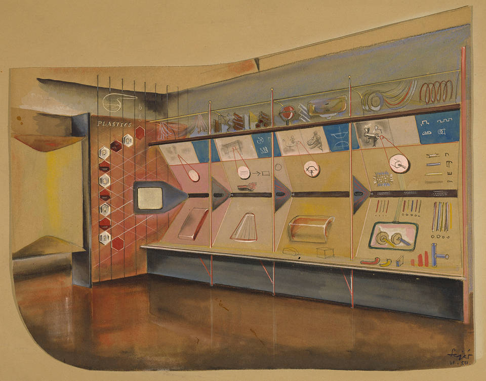 رابین دی (Robin Day) که بیشتر به خاطر طراحی مبلمان، بهویژه صندلیهای تالار جدید «رویال فستیوال هال» شهرت داشت، در طراحی گرافیکی جشنواره نیز نقش مهمی ایفا کرد. در پوستر «نمایشگاه علم» او، نماد طراحی گیمز در گوشه پایین سمت چپ دیده میشود؛ طرحی که در مرکز آن نقشه بریتانیا بهصورت هستهای در میان حلقههایی از الکترونهای در حال چرخش قرار دارد. این نماد اتمی، یادآور نقش عظیم علم و فناوری در پیروزی متفقین در جنگ بود.